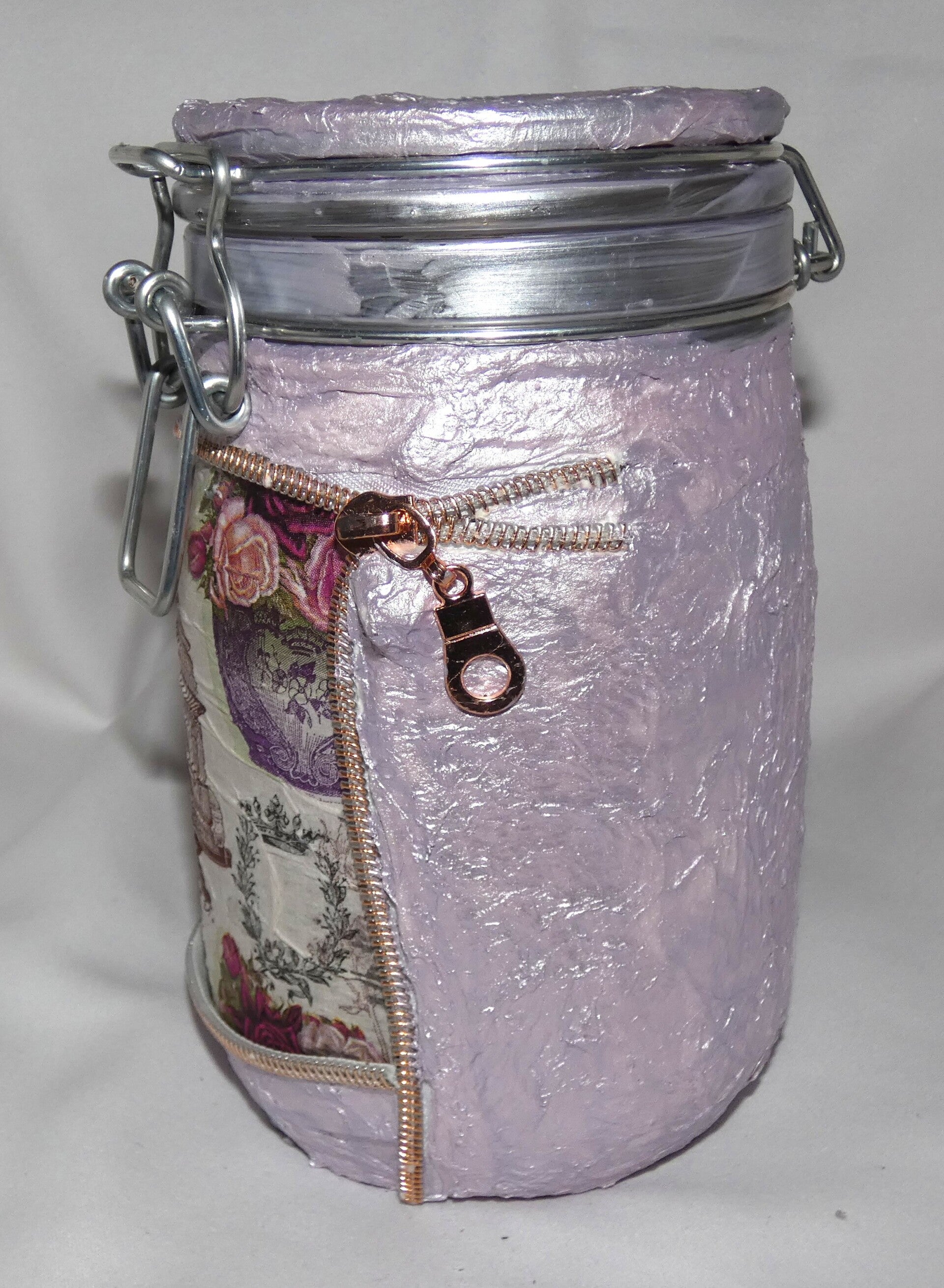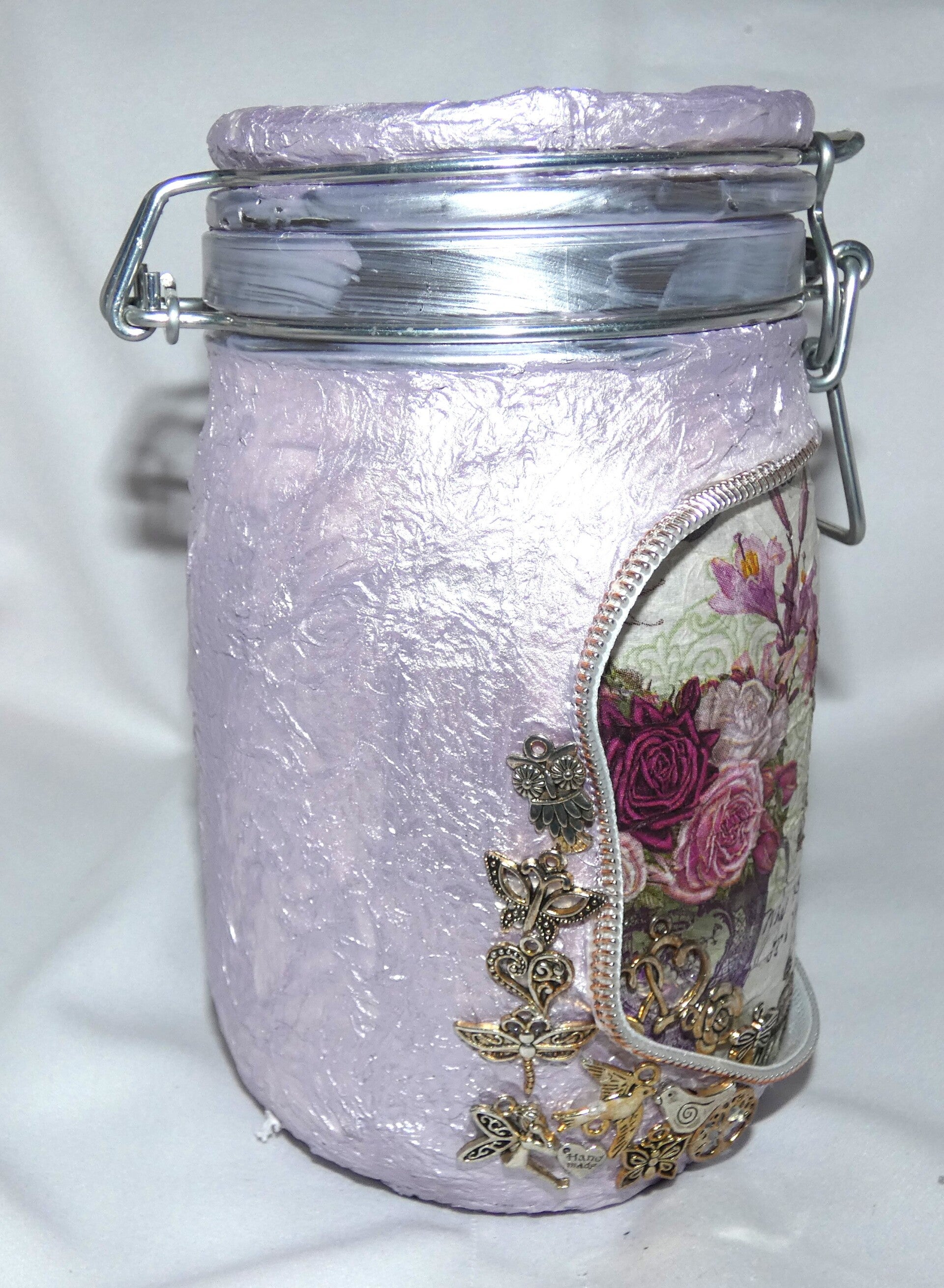 Drahtbügelglas, zartlila mit Rosen-Motiv (LED möglich)