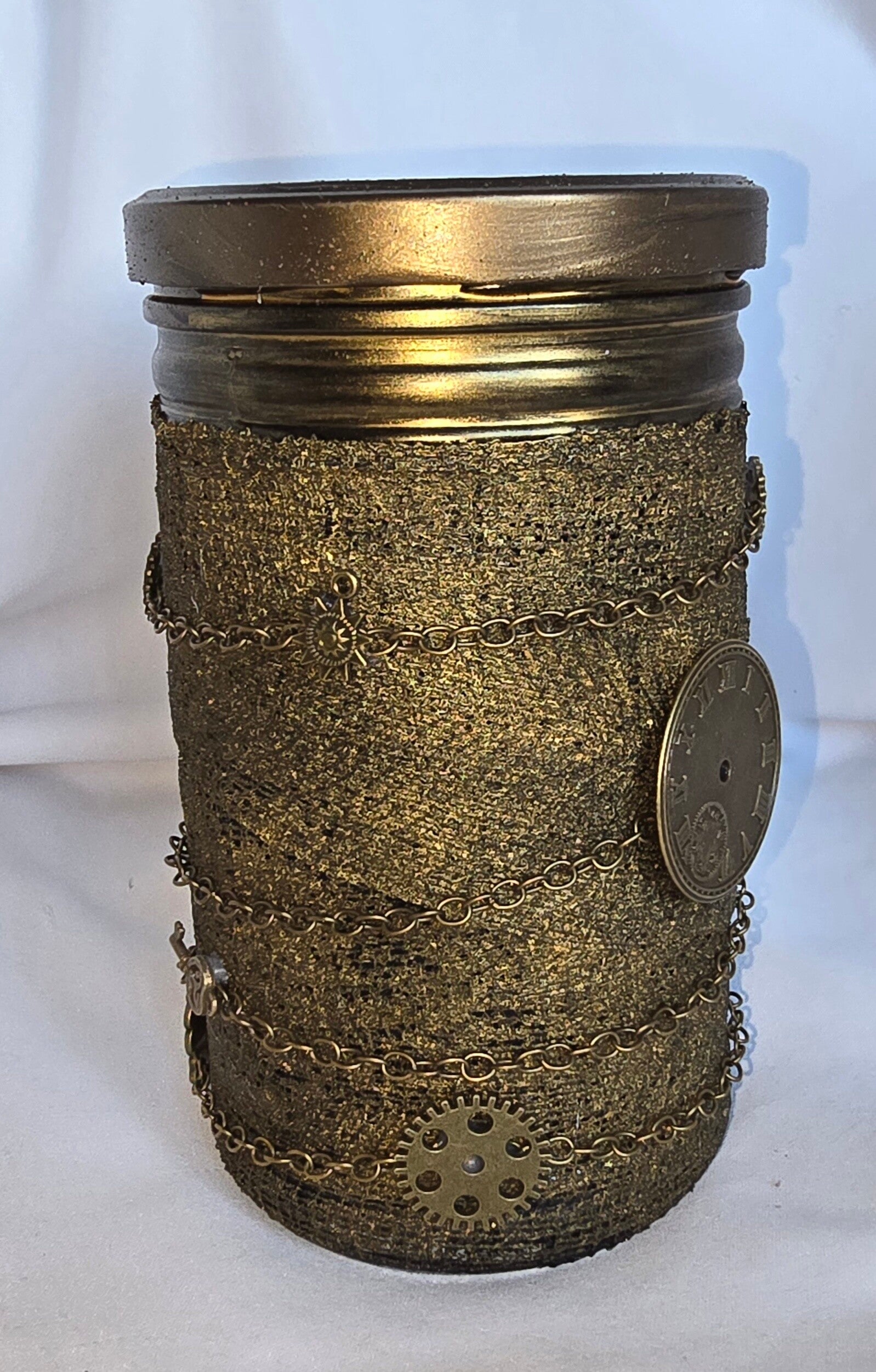 Schraubglas bandagiert mit bronzefarbenem Kettchen