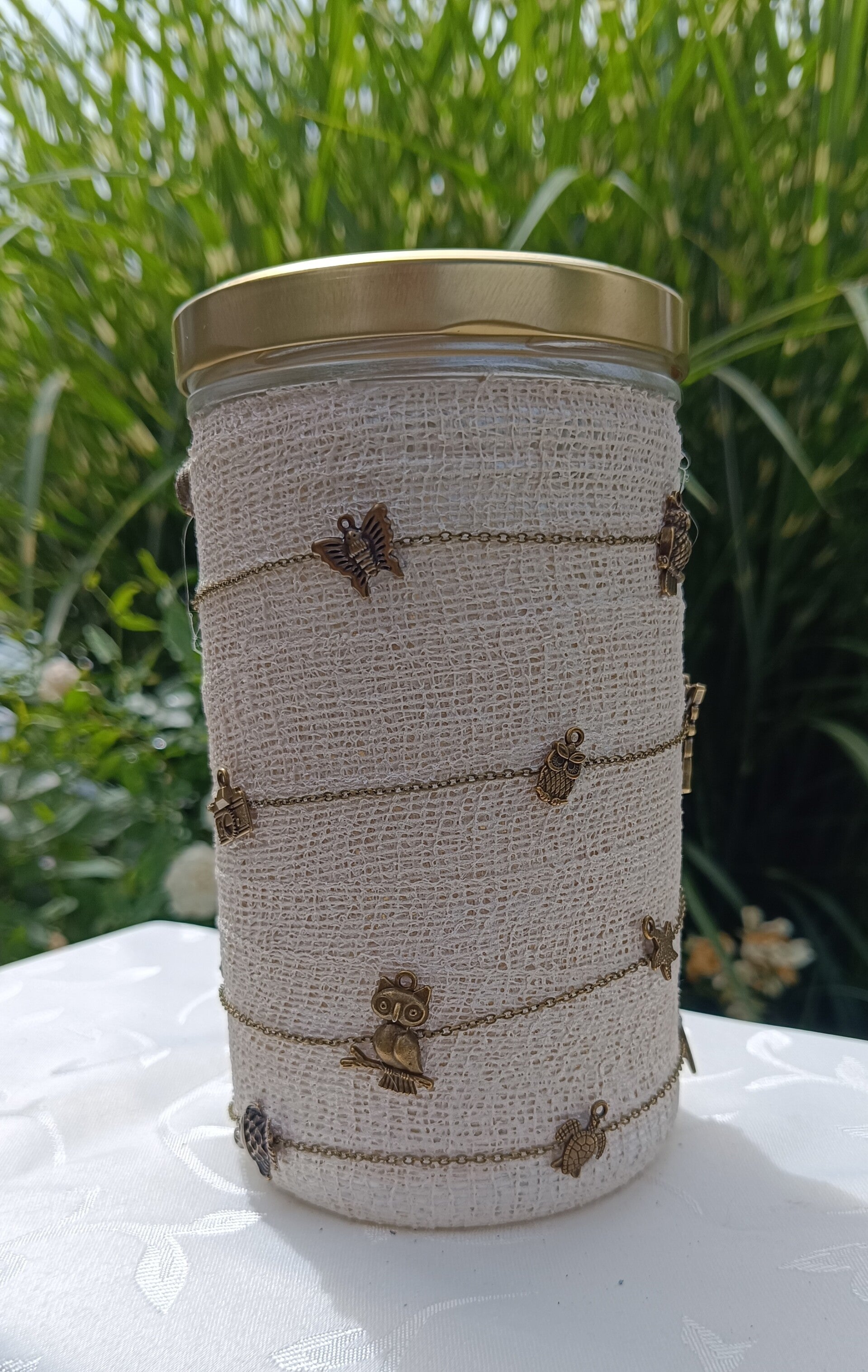 Schraubglas bandagiert mit bronzefarbenem Kettchen