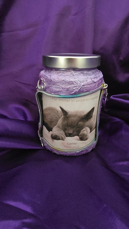 Individuell angefertigte Urne mit Foto und Text, von Ihnen komplett bereitgestellt, oder von mir designed. (Foto und Wunschtext muss geschickt werden.)